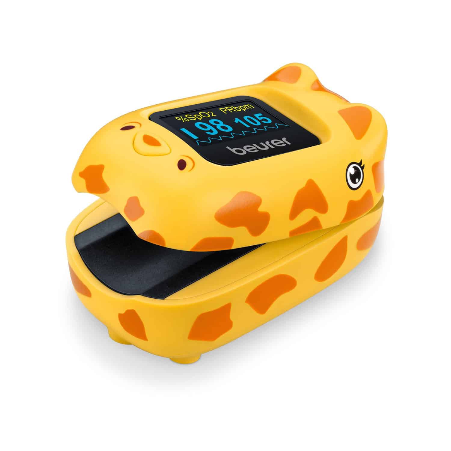 Das Beurer Pulsoximeter PO 13 Kids misst Sauerstoffsättigung und Puls dank süssem Giraffendesign spielerisch und schmerzfrei.