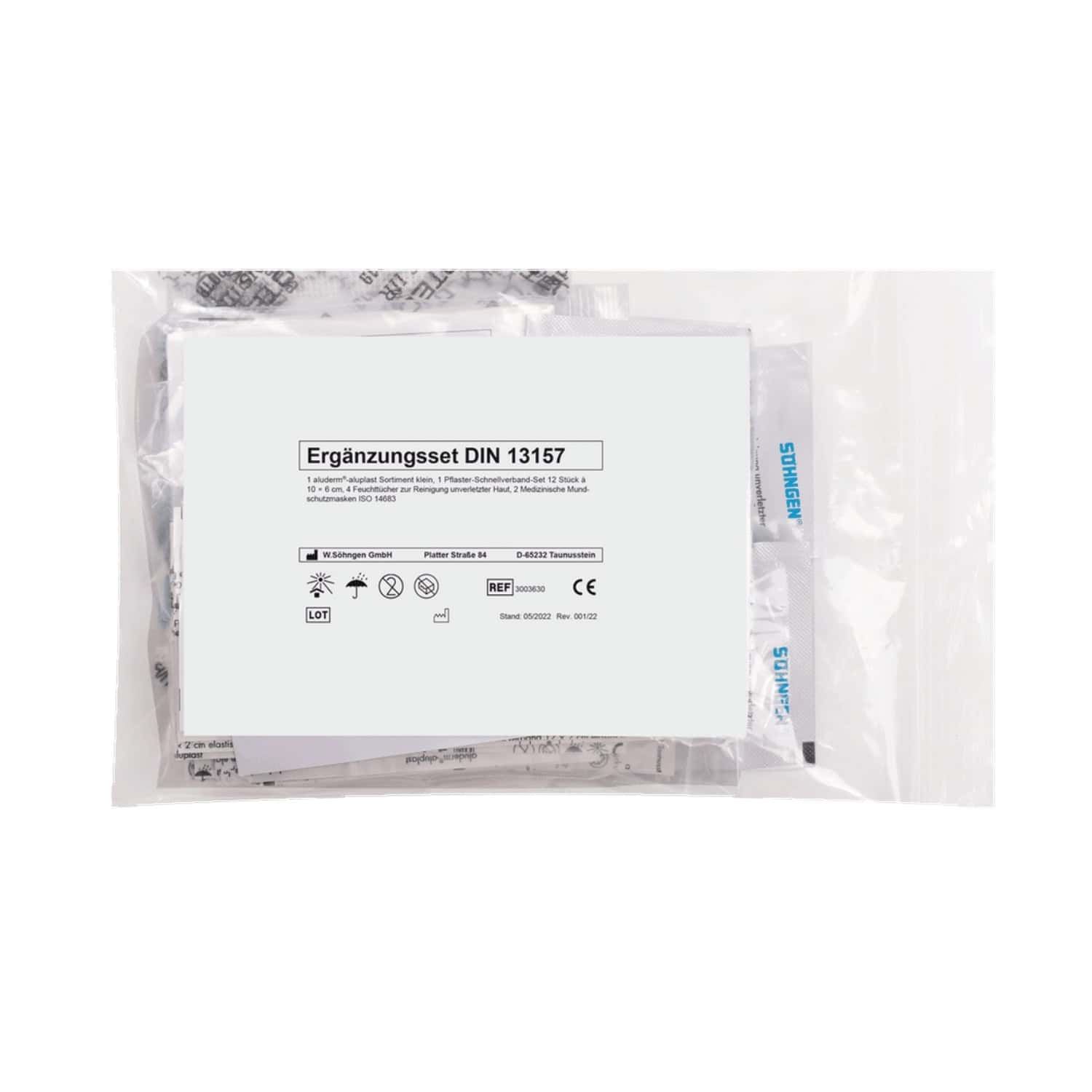 Das Ergänzungsset für die Normaktualisierung DIN 13157 von Söhngen dient zum Ergänzen der vorhandenen Erste-Hilfe-Materialien, welche nach DIN 13157 gefüllt sind. Durch die Gesetzesänderung im Jahr 2021 ist es notwendig geworden, die vorhandenen Materialien der DIN 13157 zu ergänzen. Mit diesem Ergänzungsset erfüllen Sie die DIN-Änderung 2021.